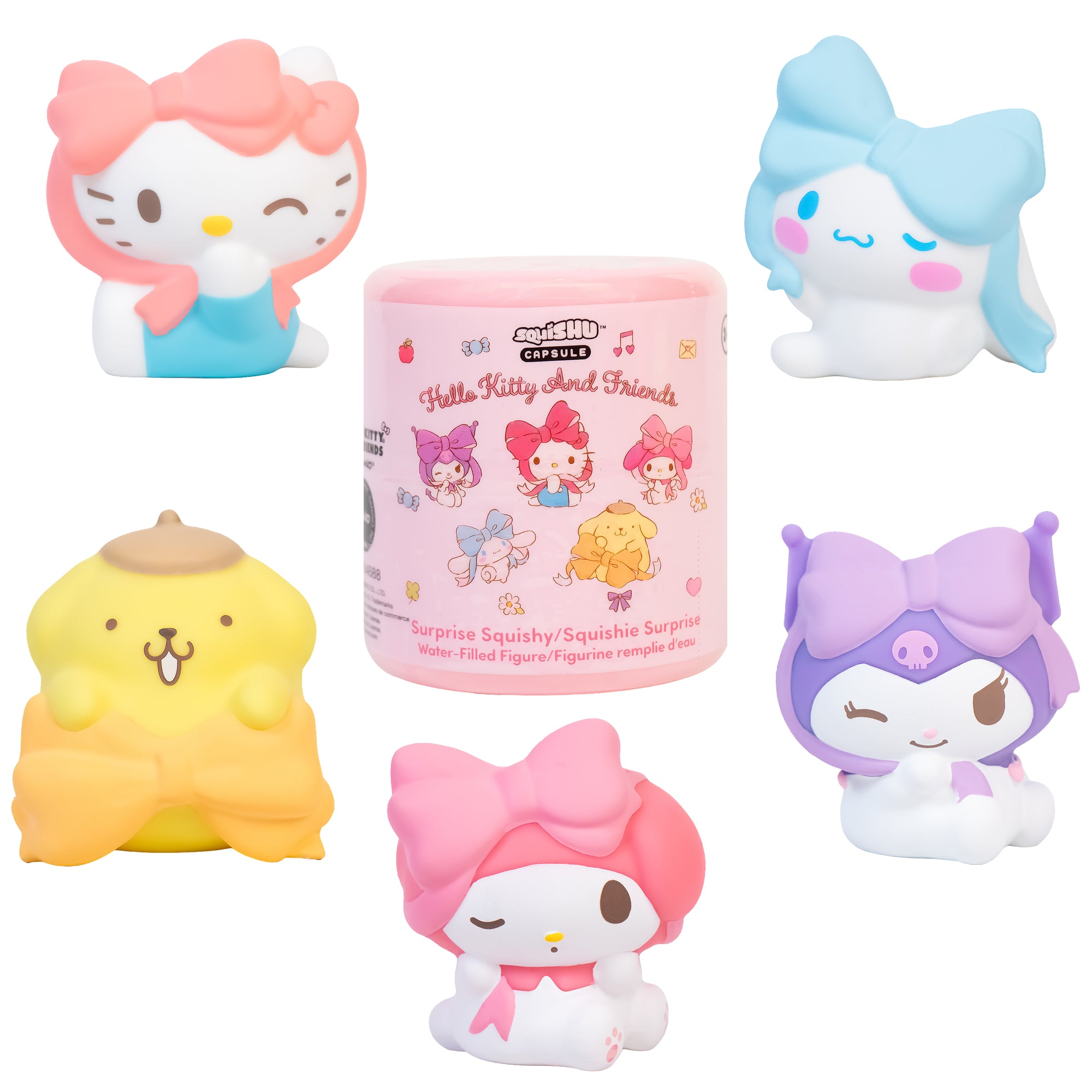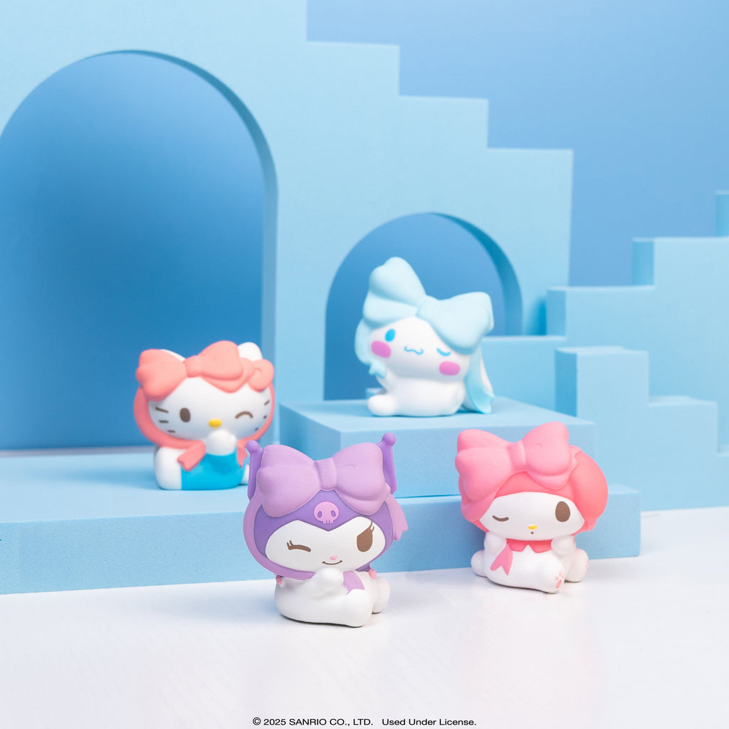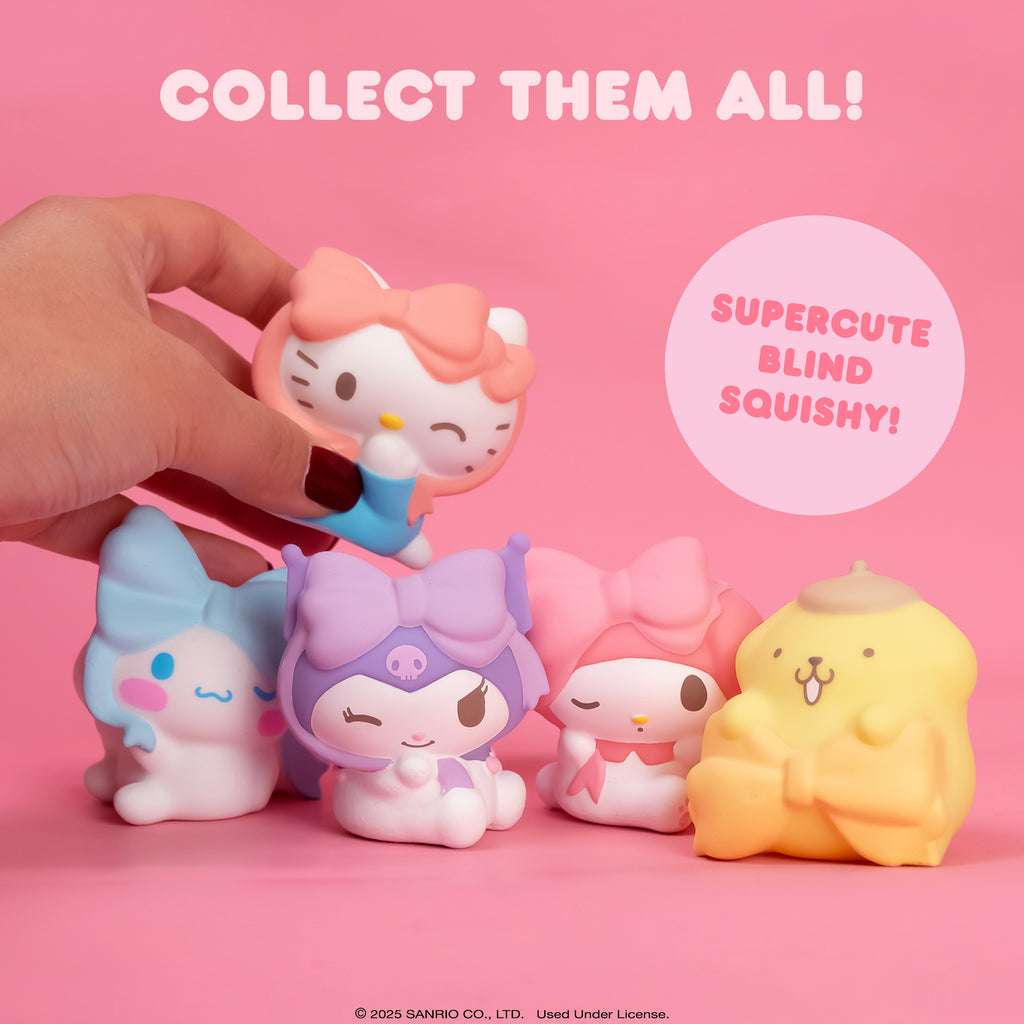 OFFICIALLY LICENSED LOVELY RIBBON SERIES BLIND BOX TOYS -️ Officially licensed Hello Kitty and Friends squishy toys; detailed and adorable designs featuring Hello Kitty, Kuromi, Pompompurin, My Melody, and Cinnamoroll wrapped in ribbon bows!