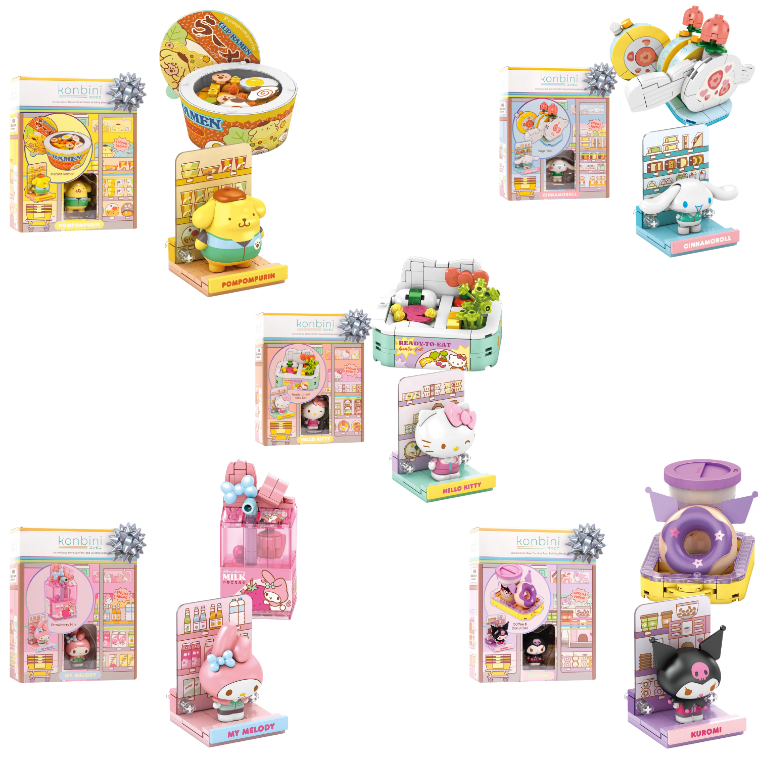 Konbini Building Blocks bring cute convenience store snacks to your Sanrio lineup. Each set includes one of 5 characters: Hello Kitty, Cinnamoroll, My Melody, Pompompurin, or Kuromi, plus a mini snack themed build to create and display. Enjoy fun, hands on building that encourages creativity, problem solving, and fine motor skills while kids and fans explore the world of Sanrio. Crafted from durable, high quality, non toxic ABS plastic, these colorful sets are made to withstand repeated play and look adorable on any shelf, desk, or play space. Safe for ages 6 and up. Collect them all to complete your Konbini style Sanrio collection. Colors may vary slightly.