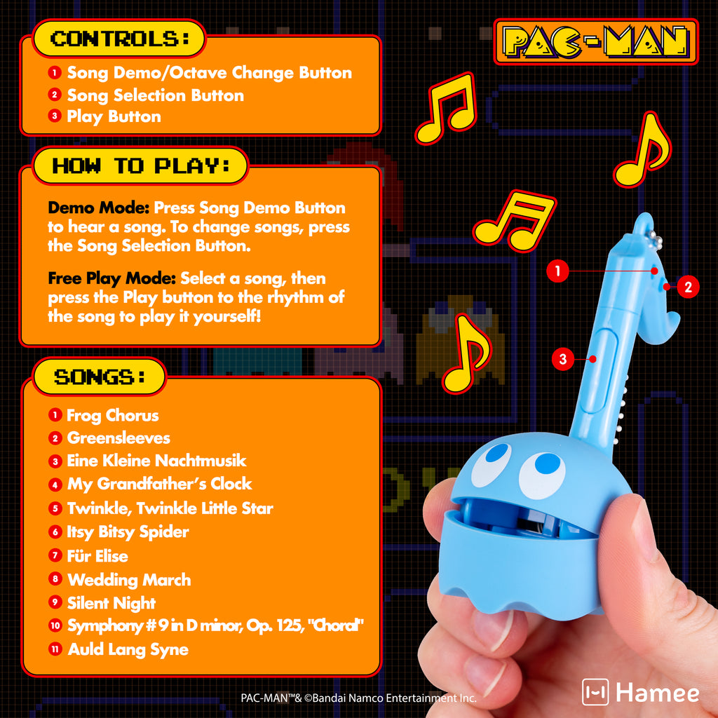• SPECIAL EDITION ♡ PAC-MAN meets Otamatone Melody! This adorable special edition mini-sized Otamatone comes programmed with several well-known songs kids can play along with, introducing them to new music and helping them learn rhythm! Available characters include PAC-MAN, plus Blinky, Inky, Pinky and Clyde the ghosts!