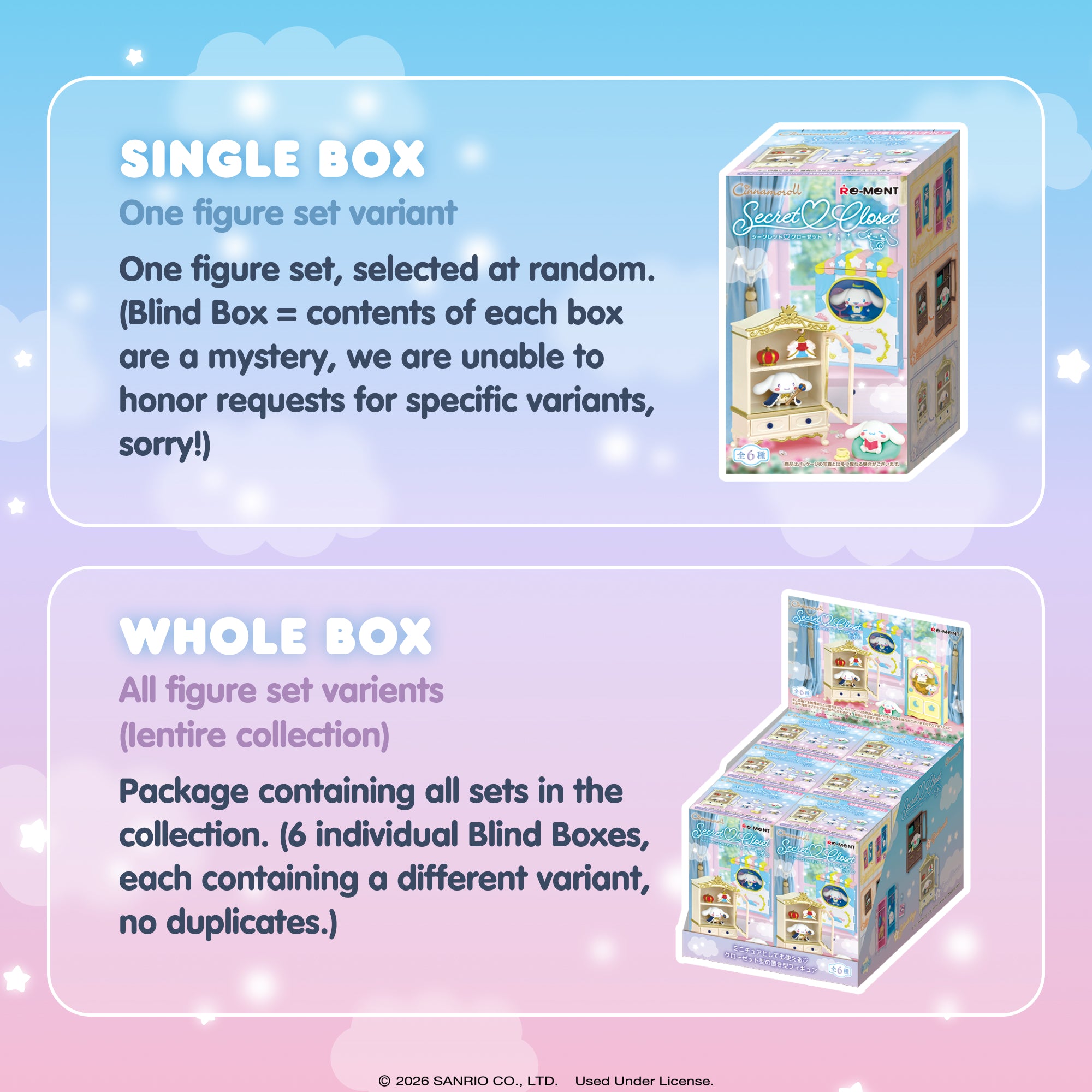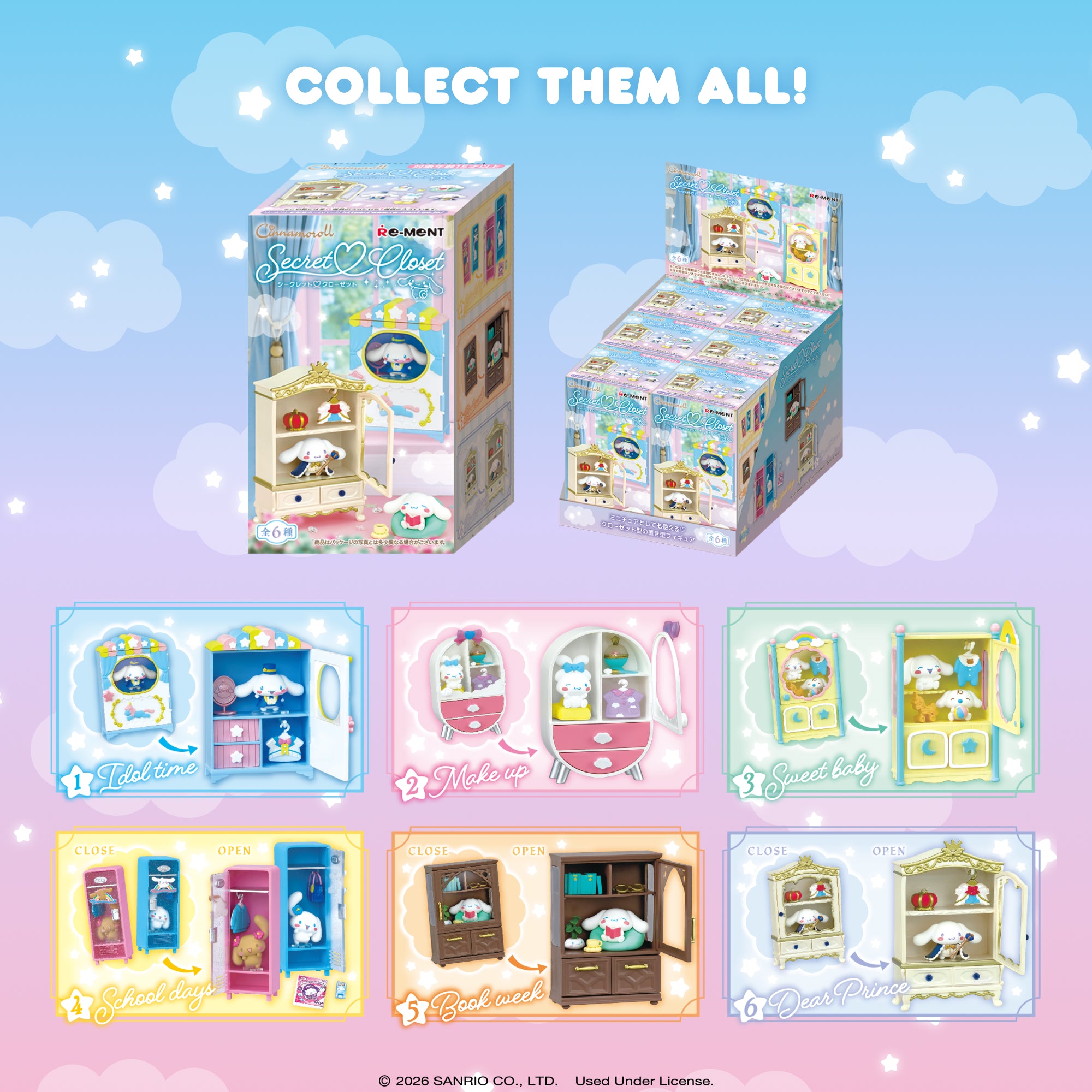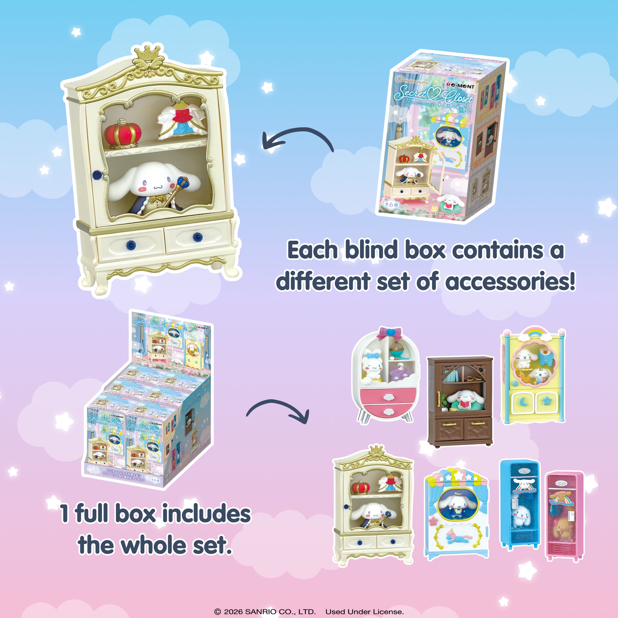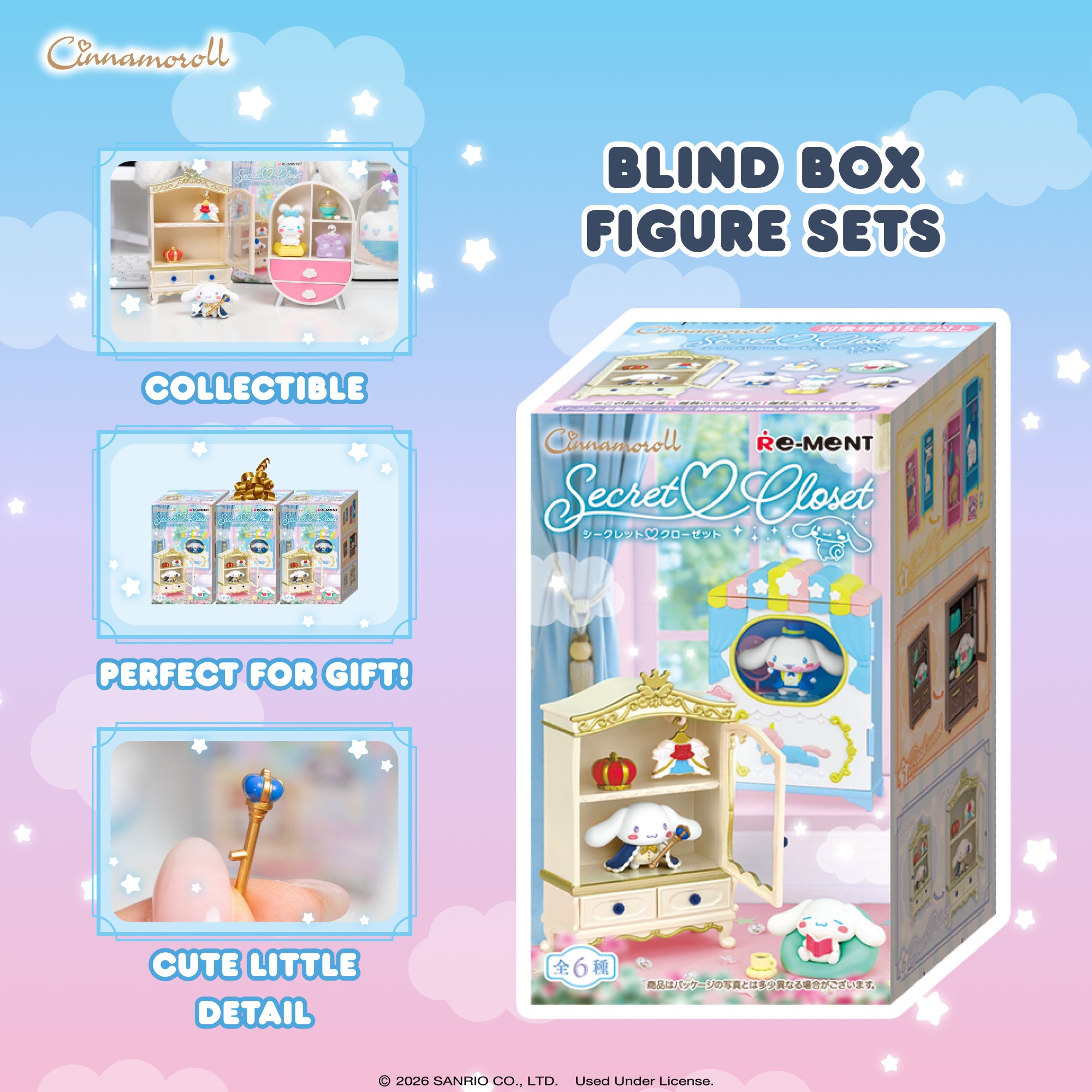 [OFFICIALLY LICENSED SANRIO MINI FIGURE SETS] ♡ Premium collectible miniature figure sets featuring Cinnamoroll, Mocha and Milk with Secret Closet! Each surprise blind box contains one of 6 mini figure sets that you can combine with other RE-MENT figures to display in tons of creative ways!