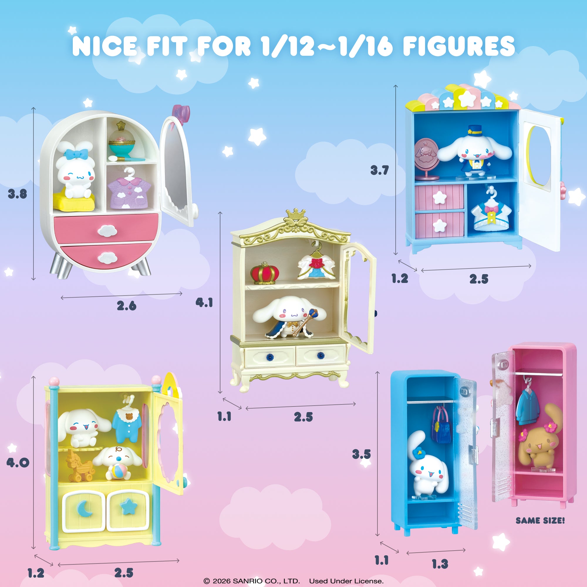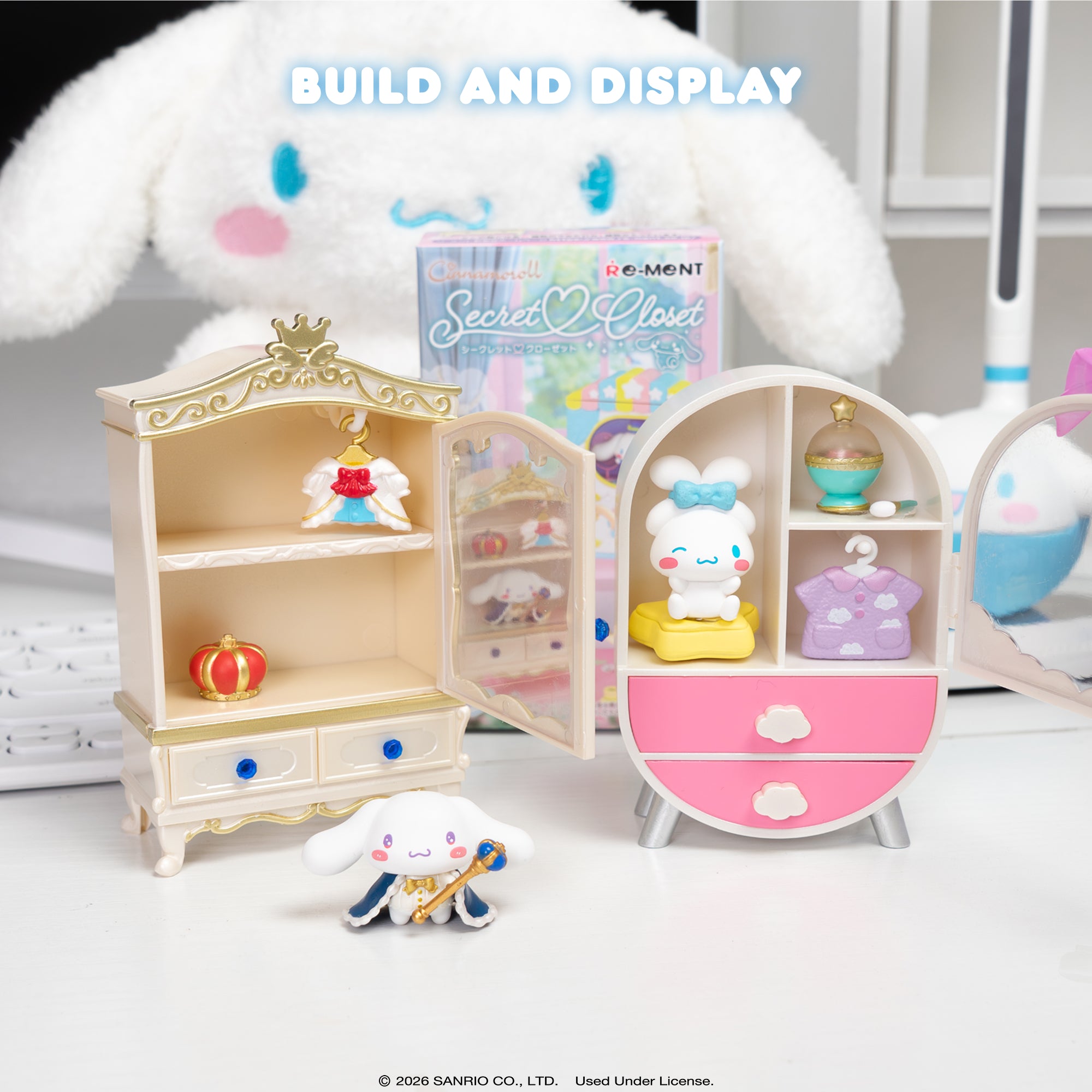[FUN TO ASSEMBLE AND DISPLAY!] ♡ Each set contains a variety of miniature figures, including Cinnamoroll, Mocha, Milk, props, and closet-themed accessories that let you build charming micro-scenes. Assemble furniture, merchandise displays, and props to create your own miniature Cinnamoroll-themed closet props!